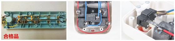 大家通過(guò)仔細(xì)觀察可以看到劣質(zhì)產(chǎn)品已經(jīng)完全融化了,這就是之前提到的排插線材問(wèn)題。由于線材質(zhì)量太差,在長(zhǎng)時(shí)間的家庭使用中,過(guò)載的電流把劣質(zhì)的線材融化,而插頭也因?yàn)殡娏鞯膿舸蚨麄€(gè)壞掉了。