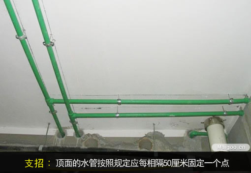 PPR水管在頂面上必須固定,按規(guī)定,應(yīng)每相隔50厘米固定一個點。而且要注意,管道不能與點燈等會發(fā)熱的電器靠的太近,以免被烤化。而且,施工前應(yīng)確保樓上住戶衛(wèi)生間的閉水驗收合格。