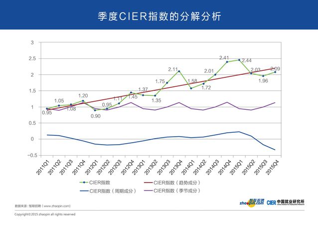 接著再來(lái)看看就業(yè)行業(yè)的景氣指數(shù),根據(jù)智聯(lián)招聘聯(lián)合中國(guó)就業(yè)研究所發(fā)布的《中國(guó)就業(yè)市場(chǎng)景氣報(bào)告》來(lái)看,CIER指數(shù)(反映就業(yè)市場(chǎng)景氣度)從三季度的1.96小幅回升至2.09,也就是每個(gè)求職者對(duì)應(yīng)2.09個(gè)職位,這主要源于四季度招聘需求有所回升,而求職者面臨春節(jié),申請(qǐng)數(shù)量有所下降所致。剔除季節(jié)成分和趨勢(shì)成分后,僅從周期成分觀察,CIER指數(shù)全年下降,就業(yè)景氣程度持續(xù)走弱,換句話來(lái)說(shuō),未來(lái)整體就業(yè)市場(chǎng)依舊并不樂(lè)觀。