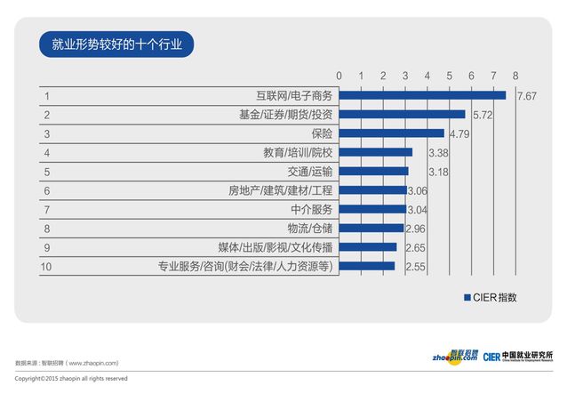 這是一個(gè)總體情況,具體到各個(gè)行業(yè)還是千差萬(wàn)別,比如互聯(lián)網(wǎng)行業(yè),無(wú)論是技術(shù)工程師、設(shè)計(jì)、編輯、產(chǎn)品經(jīng)理,需求都是極大的。完全看不出來(lái)經(jīng)濟(jì)不好,宏觀經(jīng)濟(jì)走弱的一點(diǎn)點(diǎn)影子。CIER指數(shù)顯示,這個(gè)行業(yè)的崗位和人員供給比例竟然達(dá)到了7.67,一個(gè)求職者有7.67個(gè)崗位可以選擇,所以反過(guò)來(lái)說(shuō),如果你是互聯(lián)網(wǎng)行業(yè)的人才,那完全可以理直氣壯的跟老板談加薪,如果他拒絕,你完全具備跳槽的資本。