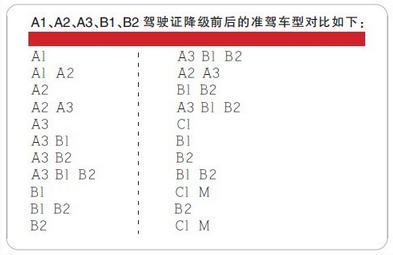 小型汽車(chē)、摩托車(chē)等車(chē)型不存在降級(jí)的問(wèn)題。需要提醒的是,符合降級(jí)條件的,每次只注銷(xiāo)準(zhǔn)駕車(chē)型中級(jí)別最高的一個(gè)車(chē)型,如駕駛?cè)顺钟蠥1、A2兩個(gè)級(jí)別代號(hào)的駕駛證,第一次只注銷(xiāo)A1。