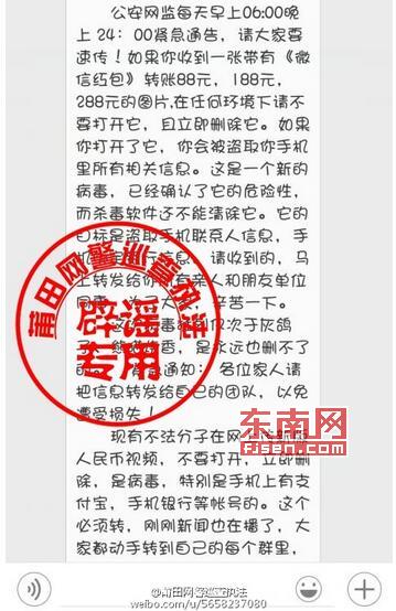 莆田市建材網(wǎng)莆田7月14日訊,近日,朋友圈里又在瘋傳一條信息,稱“接到公安網(wǎng)監(jiān)緊急通知,‘微信紅包’圖片帶毒”。對此,莆田公安局網(wǎng)絡(luò)安全保衛(wèi)支隊(duì)回復(fù),該消息系謠言,但同時(shí)提醒廣大網(wǎng)友要保持警惕。